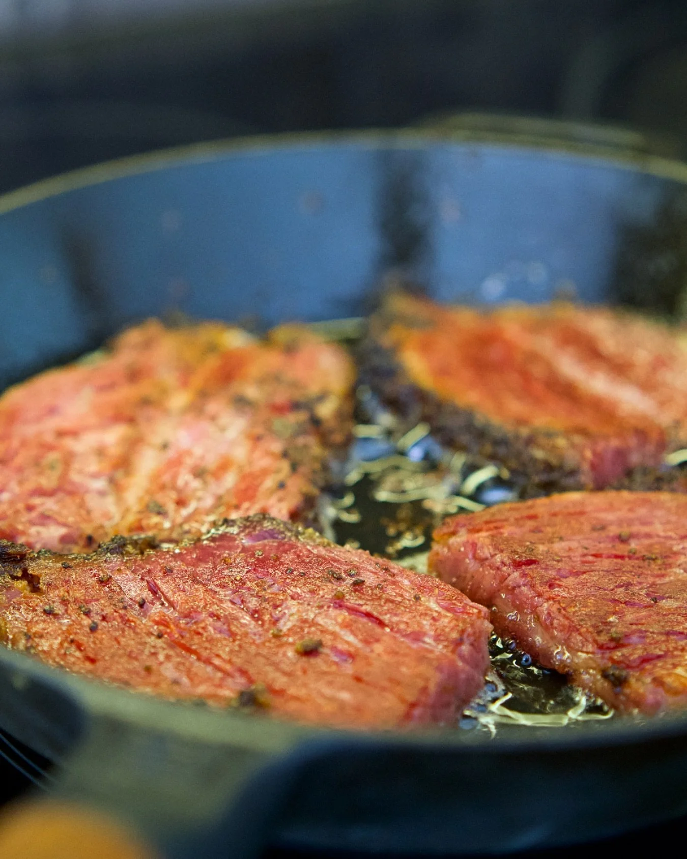 Bring pan to medium heat, sear pastrami slices for 1–2 minutes per side for a warm centre and caramelised edges.