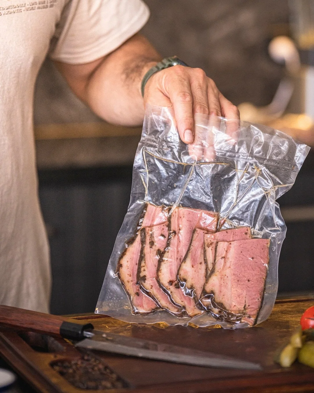 Place your vacuum-sealed pastrami pack in simmering water for 4-5 minutes for perfectly warmed, tender slices.